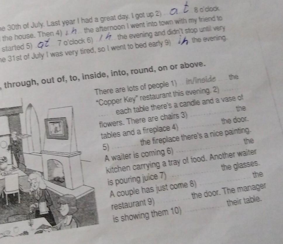 Fill in: in, opposite, through, out of, to, inside, into, round, on or above.
