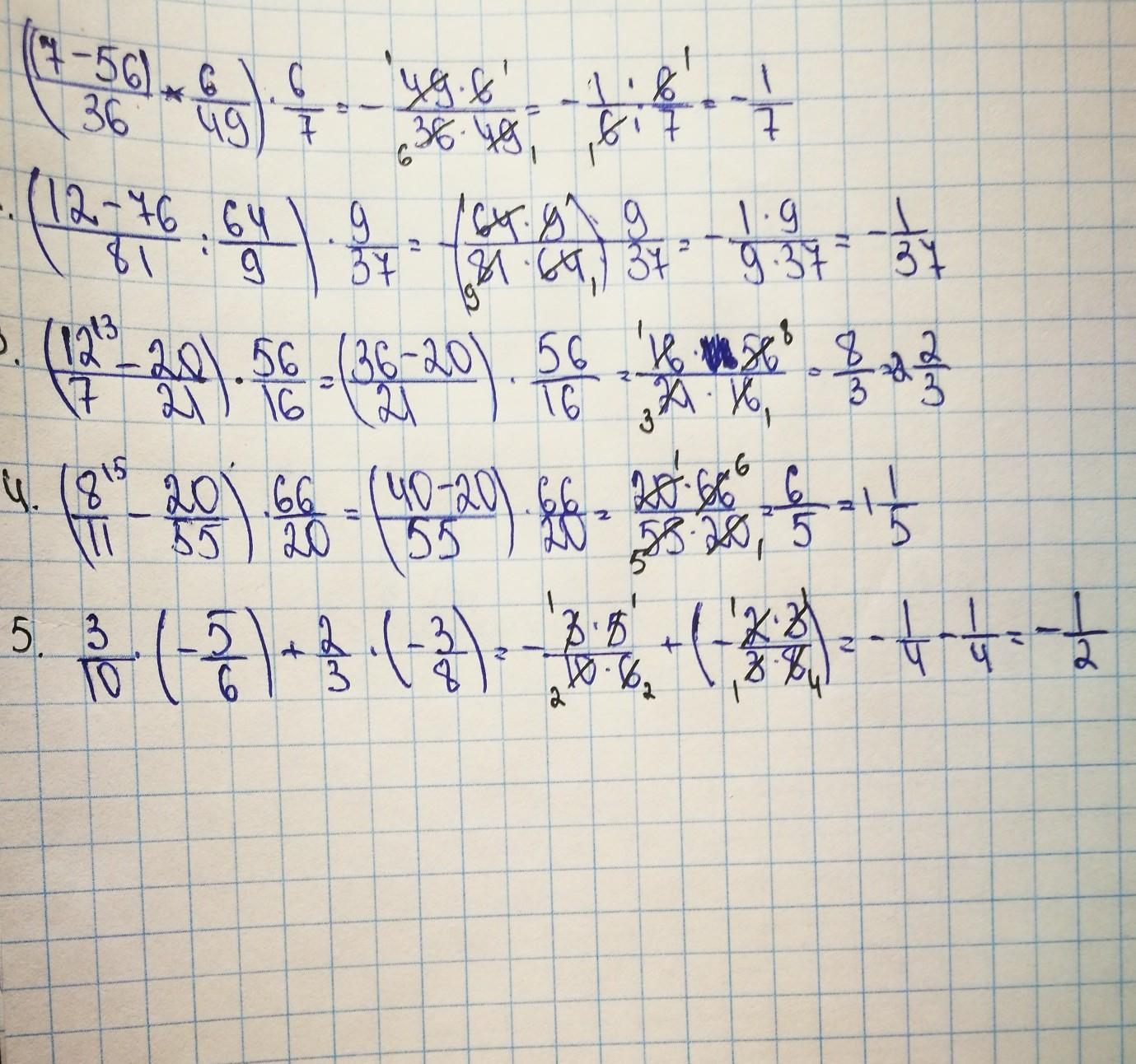 При делении дробей мы переворачиваем вторую дробь и умножаем :( -49/36)×6/49. 49 сокращается, оставляя 1. 36 и 6 тоже сокр - вместо 36 у нас 6. Итак, минус одна шестая умножить на одну первую будет -1/6. Ну а дальше умножение. -1/6×6/7, шестёрки сократились, осталось -1/7. Всё предельно просто, попробуй решить остальное самостоятельно, всё таки не мне сдавать за тебя экзамены)
