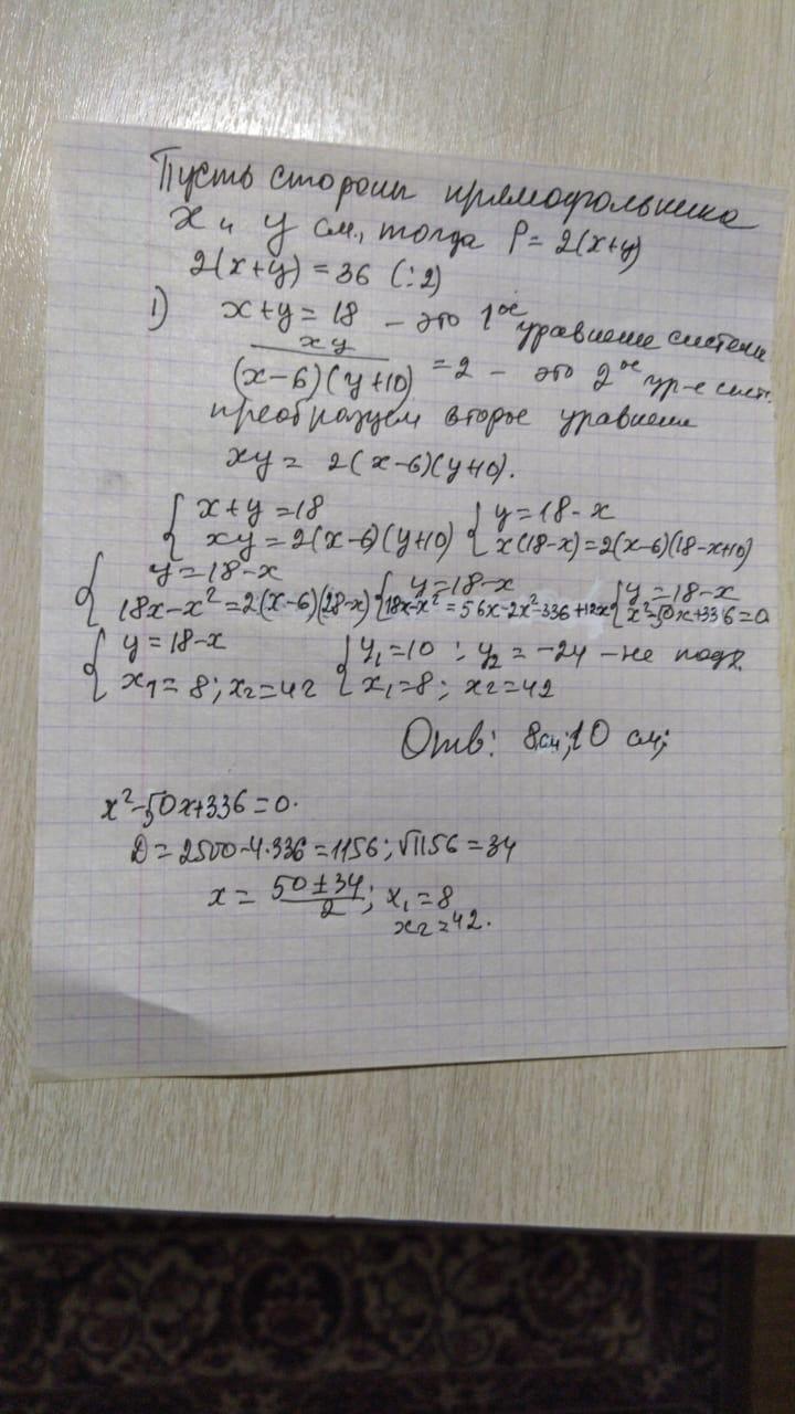 Примем стороны за X и Y. Тогда 2(X+Y)=36; его площадь - XY; тогда формула второй площади: (X+10)(Y-6)=1/2 * XY. Составим и решим систему уравнений: