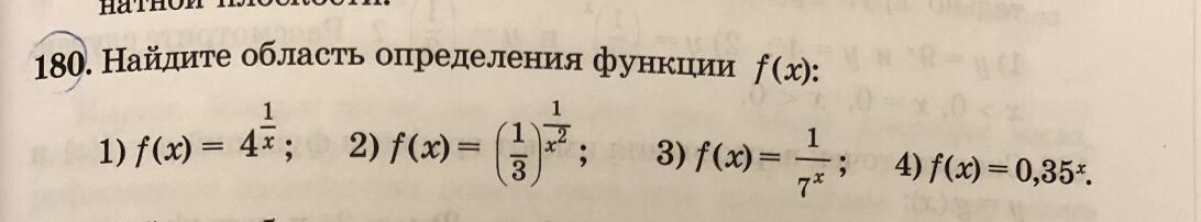 Ответ: 1) и 2) (-∞; 0)∪(0; +∞); 3) и 4) R