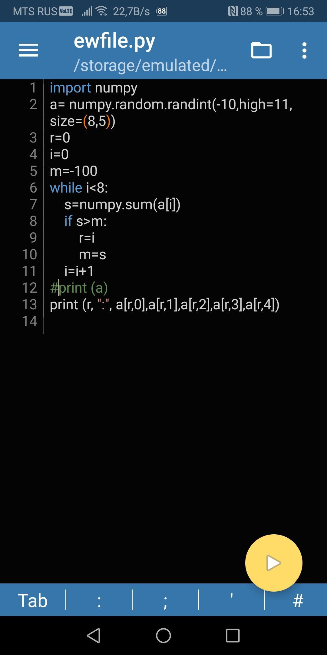 Заполнить матрицу из 8 строк и 5 столбцов случайными числами в интервале [-10;10] и вывести ее на экран. Вывести на экран строку, сумма элементов которой максимальна. Формат вывода : 2 : 3 5 8 9 8