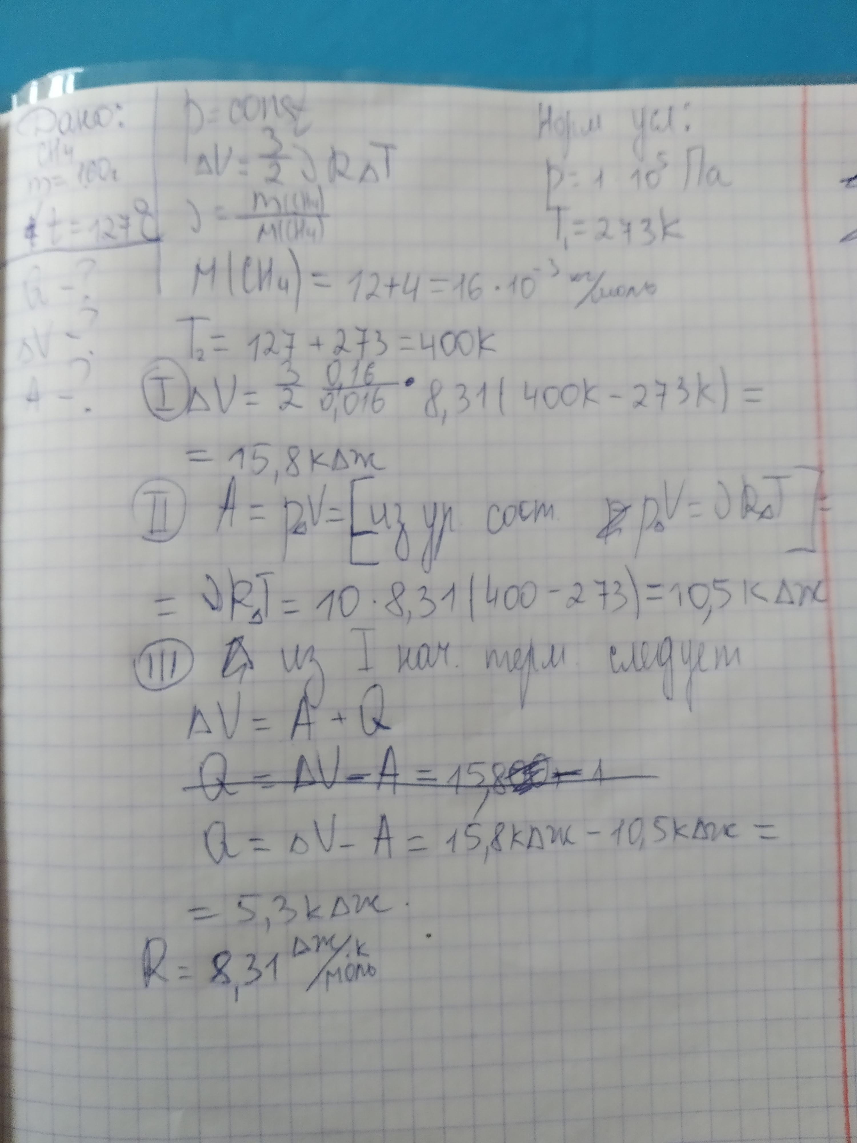 СРОЧНО 160 г метана, находящегося при нормальных условиях изобарно нагрели до 127 ° C. Определить количество теплоты, полученное газом, изменение его внутренней энергии и работу газа.