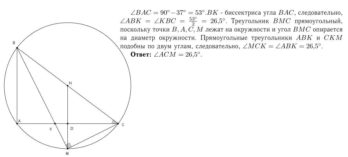 Дан прямоугольный треугольник ABC с гипотенузой BC. Пусть N – середина BC. Прямая, проходящая через N параллельно прямой AB, пересекает продолжение биссектрисы BK угла ABC за точку K в точке M. Найдите угол ACM, если ACB=37 градусов.