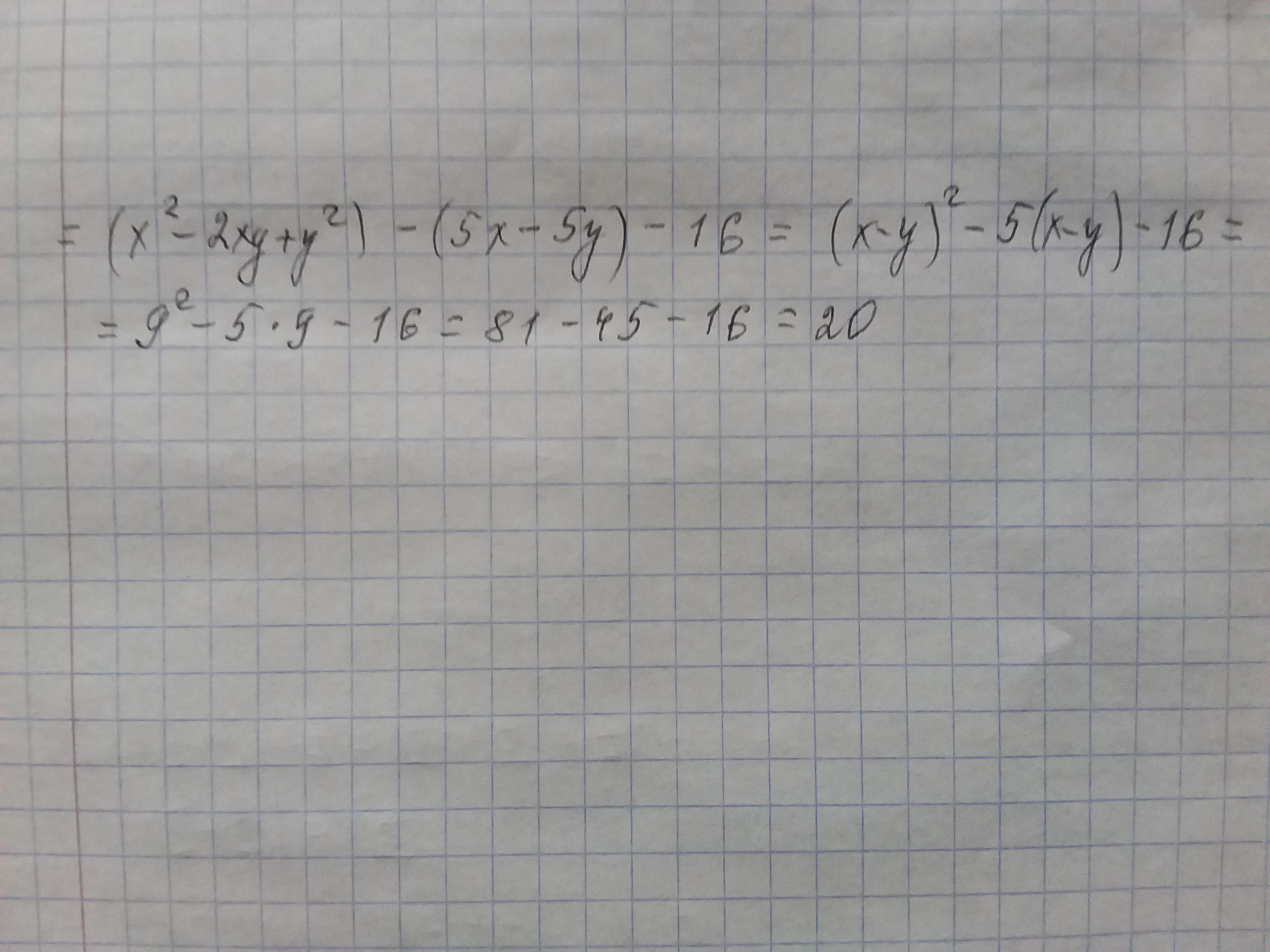 x²-2xy+y²-5x+5y-16, если x-y=9