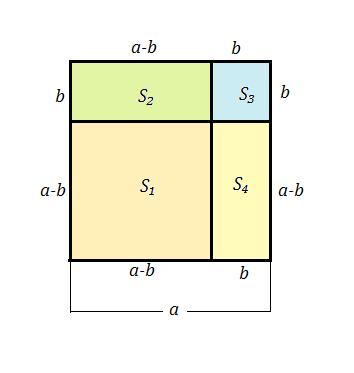 Тогда внутри большого квадрата образуются ещё два прямоугольника со сторонами "a-b" и "b" и один квадрат со стороной "a-b". Площади этих прямоугольников равны , а площадь квадрата равна
