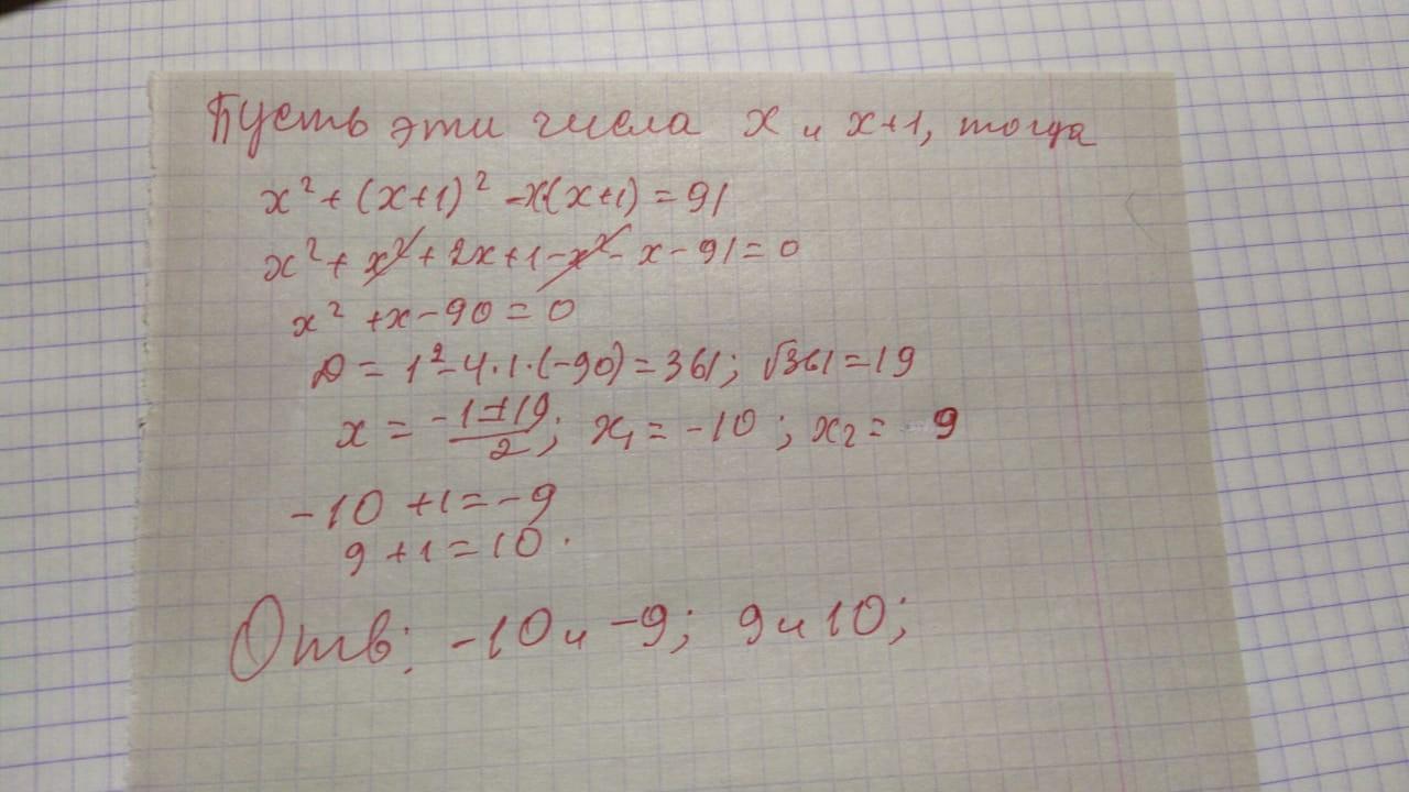 тізбектес екі санның квадраттарынын қосындысы олардың көбейтіндісінен 91 ге артық. Осы сандарды тап