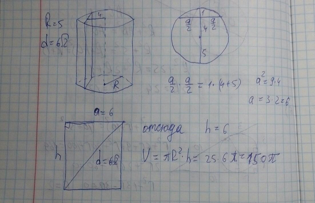 1) В цилиндре на расстоянии 4 см от его оси параллельно к ней(т.е к оси цилиндра) проведено сечение, диагональ которого равна 6√2 см. Найти объем цилиндра,если его радиус равен 5 см.