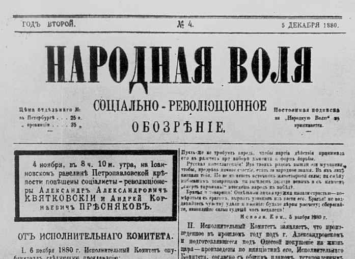 Во главе с Андреем Желябовым и Софьей Перовской мы избрали исполнительный комитет, который планирует убийство правительственных чиновников и даже императора Александра II. Все тщательно спланировано. Наш план воплотился в жизнь – Александр II, был убит нами 1 марта 1881. Но история сделает вывод о нашей деятельности: правы мы были или нет.