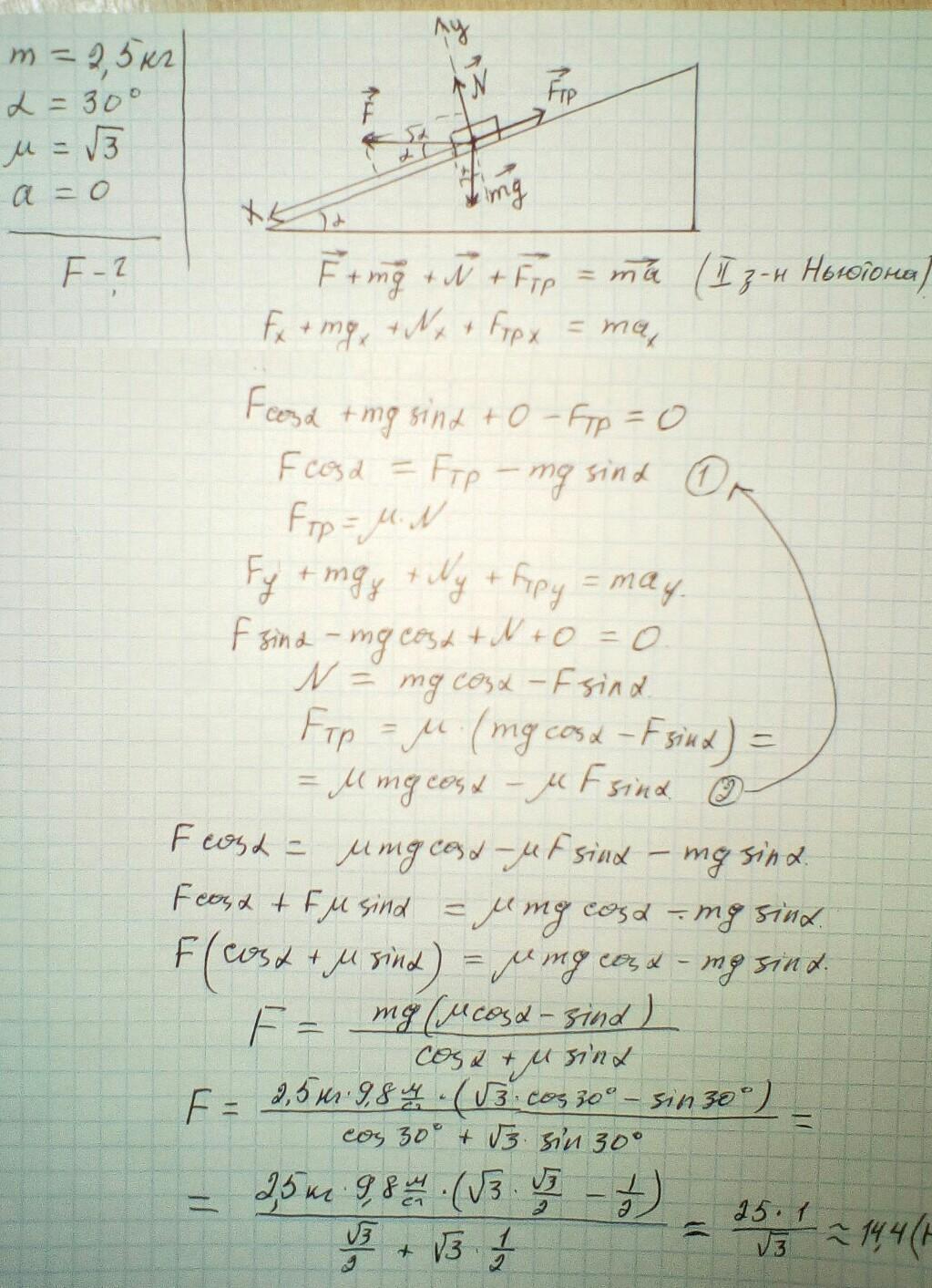 На наклонной плоскости с углом наклона к горизонту α = 30° лежит тело массы m=2,5 кг. Найдите, какую минимальную горизонтальную силу нужно к нему приложить, чтобы тело поехало вниз вдоль плоскости.