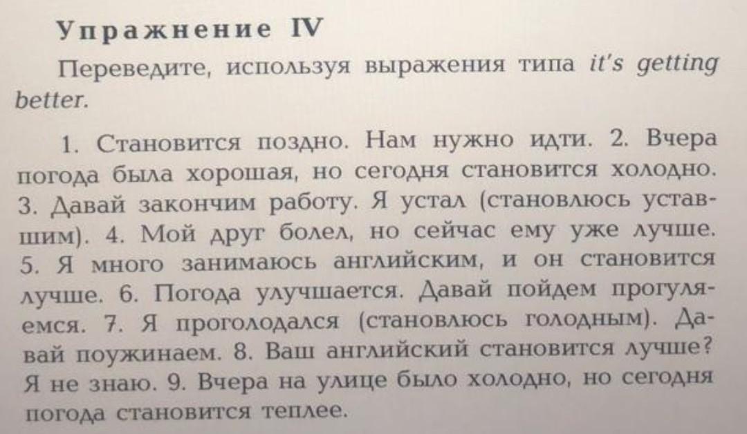 1. It’s getting late. We need to go. 2. The weather yesterday was good, but today it’s getting cold. 3. Let’s finish the work. I’m getting tired. 4. My friend was sick, but now he’s getting better. 5. I learn English a lot, and it’s getting better. 6. The weather is getting better. Let’s go for a walk. 7. I’m getting hungry. Let’s have a dinner. 8. Is your English getting better? I don’t know. 9. It was cold yesterday on the street, but today it’s getting warmer.