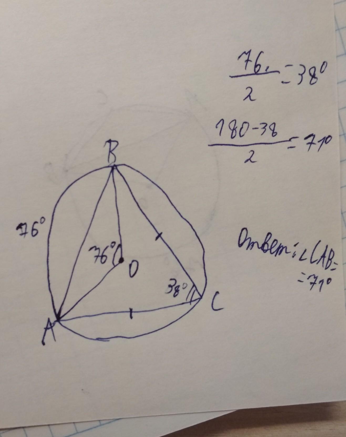 Центральный угол AOB и вписанный угол ACB опирается на дугу АВ , величиной 76 градусов . Найдите величину угла CAB при основании AB равнобедренного треугольника ABC