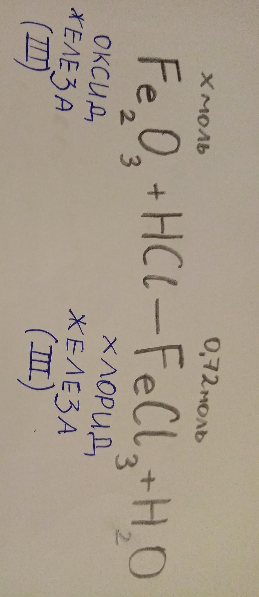 Оксид железа (III) вступает в реакцию обмена с соляной кислотой. Вычислите какое количество вещества оксида железа (III), потребуется для получения 0,72 моль хлорида железа (III).