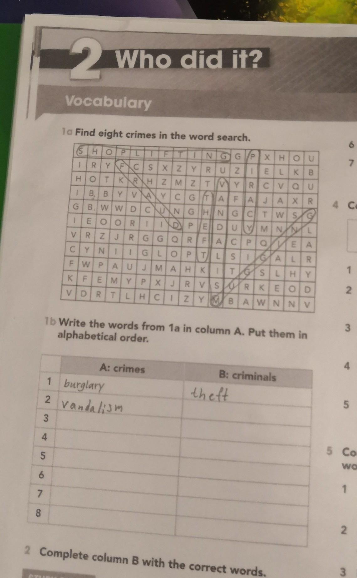 Всё выделенные слова идут в crimes. + слово robbery (если начинать с левой верхней клеточки, то 1 вправо, 1 вниз. Дальше само слово вниз.)