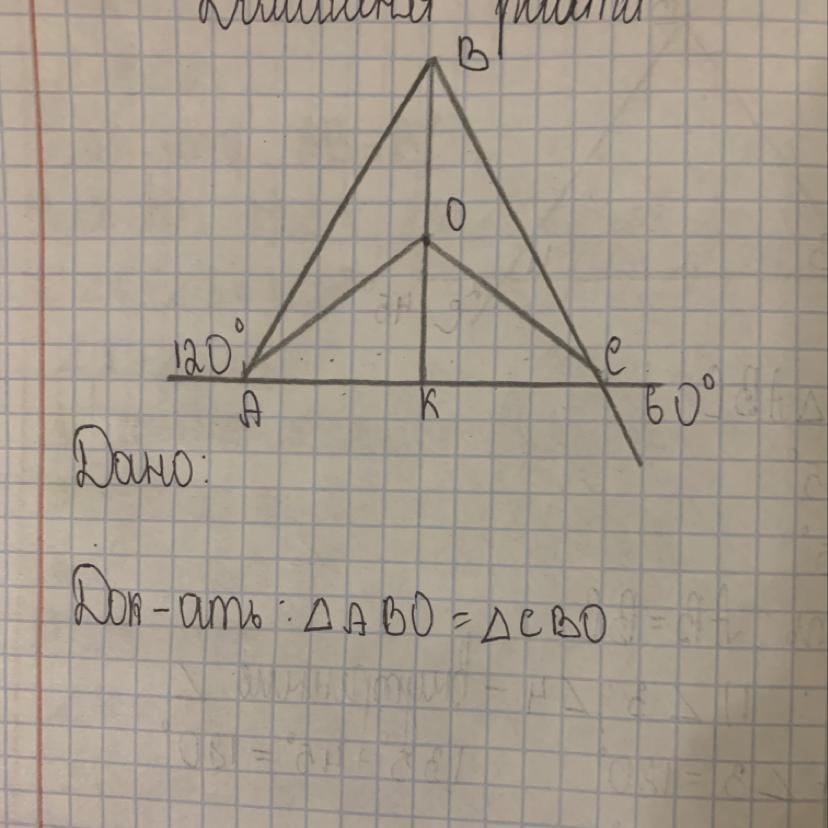 Рассмотрим два трехугольника- ABO и BCO, по условию нам дали бессектрису.Она делит углы по полам. У данных трёхугольников общая сторона BO. Рассмотрим прямую BC ее пересекает прямая AC нижний угол прямой BC 60 гр. значит верхний 60+60=120гр.( развернутй угол 180 гр.) По признаку вертикальных углов эти углы равны,значит угол КСB = углу CAB. Если углы при основании равны значит трехугольник равнобедренный. Следовательно стороны AB и BC равны.Теперь переходим к вопросу стороны AB и BC равны, сторона BO общая, углы ABO и CBO равны , так как бессектриса. Значит по 1 признаку равенства трехугольников ( угол и две стороны) трехугольники ABO и СBO равны!