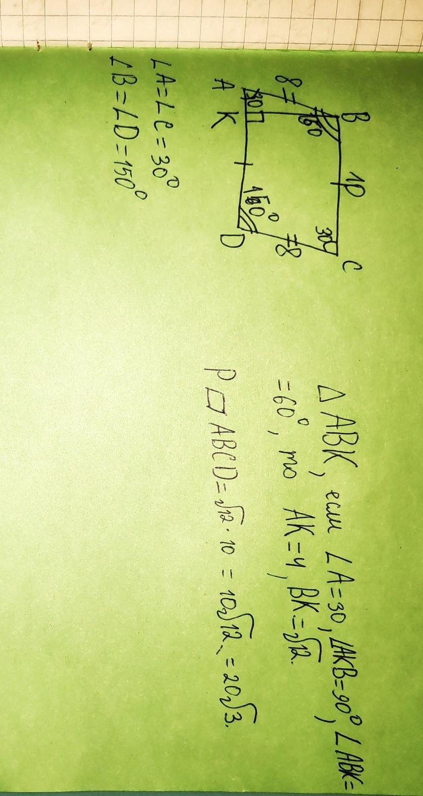 BK высота параллелограмма ,ABCD проведенная к стороне AD, угол C = 30 градусов, BC = 10 см ,CD =8 см .Найдите площадь параллелограмма.