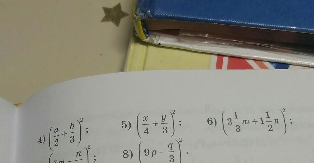 4) (а/2+ b/3)²= a²/4 + 2× a/2 × b/3 + b²/9= a²/4 + ab/3 + b²/9.