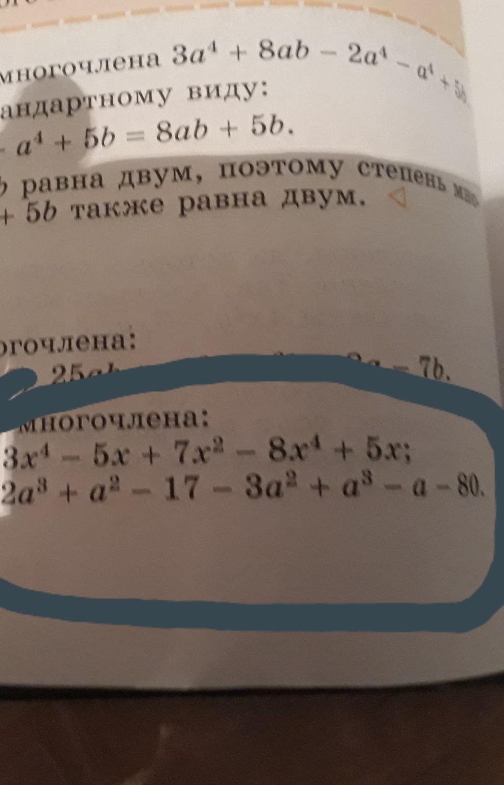Смотрите, в этих примерах нам тупо нужно складывать и вычитать. Рассмотрим первый многочлен. В 3x^4 есть нормальное число - 3, а есть x^4. Также и в 8x^4 есть нормальное число -8 , а есть x^4. Так как и у первого числа и у второго есть x^4, то мы можем провести с ними вычисления. Тоесть эти числа можно прибавлять и вычитать, потому что у них совпадают x^4 степени, если, например, у одного числа будет x^3, а у другого будет x^4, то уже нельзя будет их вычитать и складывать. Теперь мы можем довести этот многочлен до стандартного вида, проводя вычисления. Берём те же самые 3x^4 и 8x^4, мы можем их вычитать и складывать. Смотрим знаки и решаем. 3x^4-8x^4=-5x^4(просто проводим операцию с нормальными числами, а x^4 просто приписываем к результату) Тоже самое с другими числами. 5x и 5x сократятся, потому что у них у обеих есть x. И у нас остаётся 7x^2. В итоге ответ получается -5x^4+7x^2. Надеюсь вы поняли мои объяснения))) Если не поняли задавайте вопросы, я отвечу, если совсем не поняли, могу объяснить ещё раз более понятно, уже по фотографиям.