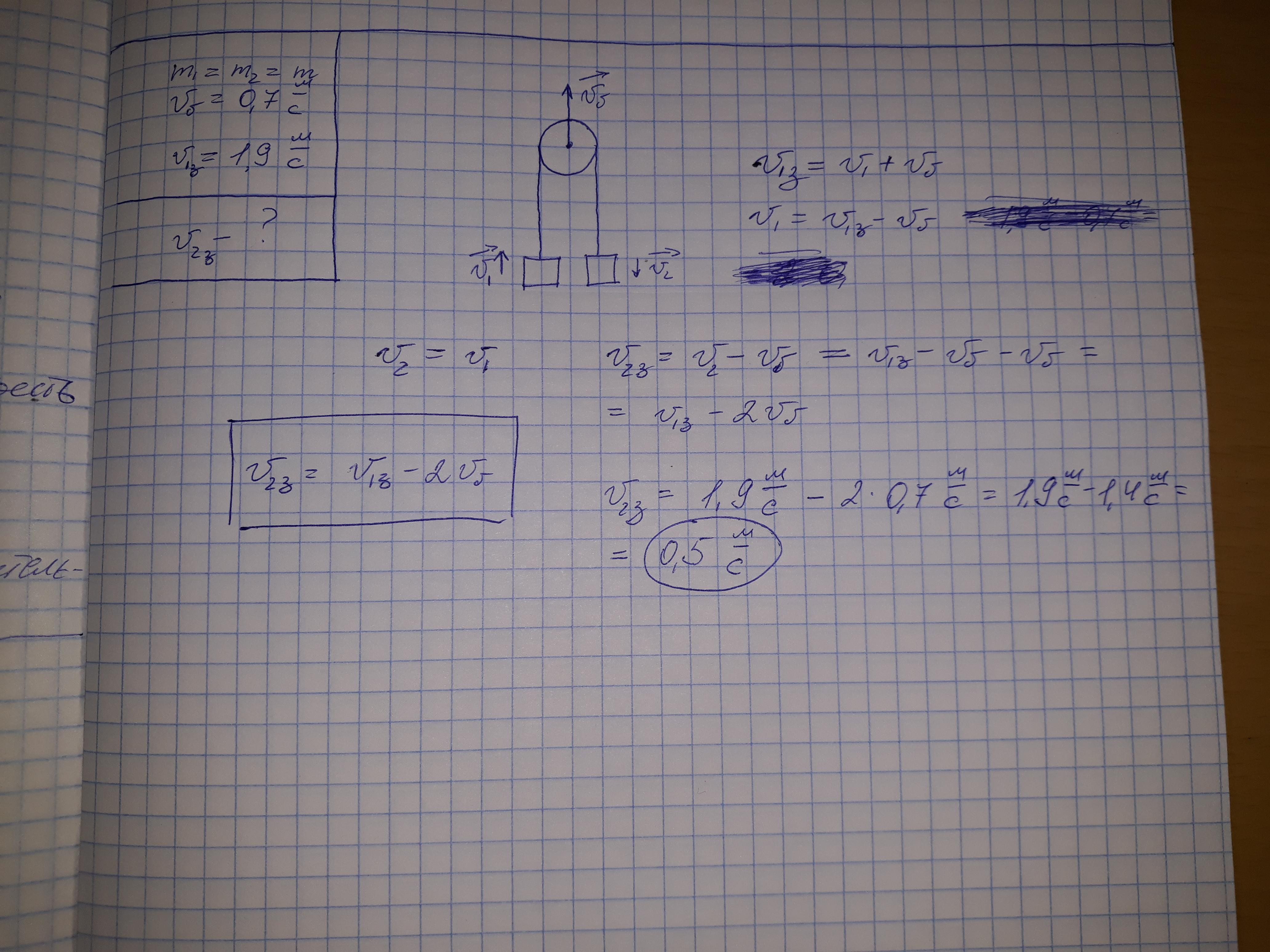 Через блок переброшена нерастяжимая нить с одинаковыми грузиками на концах. При наблюдении с земли ось блока поднимается вверх со скоростью 0.7 м/c а один из грузиков поднимается вверх со скоростью 1.9 м/c. Чему равна скорость второго грузика для земного наблюдателя, если нить остаётся натянутой? Ответ выразить в