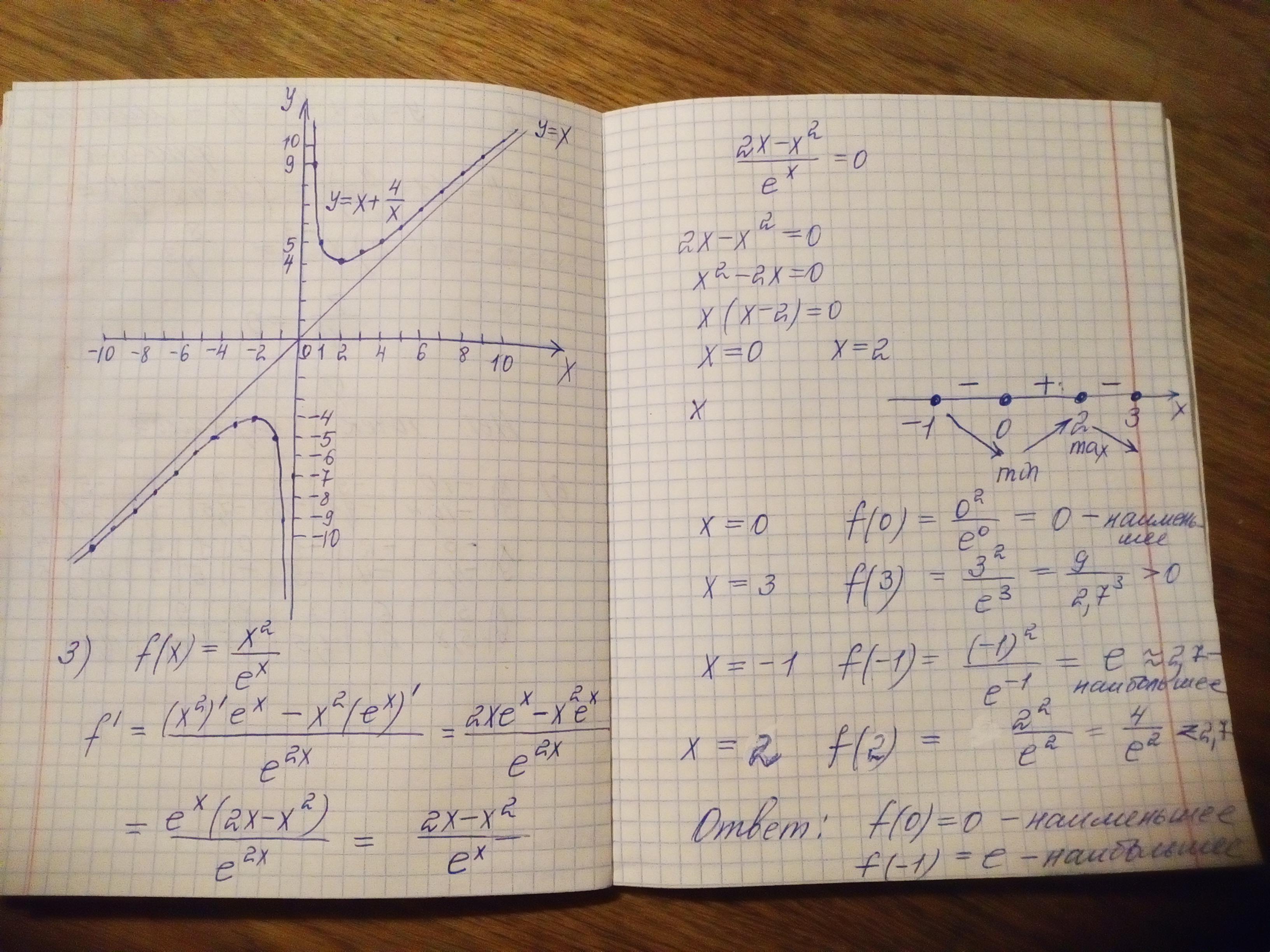 3) х^2/e^x не может быть отрицательны, значит наименьшие значение это 0 х^2/e^x = 0 при х = 0. При положительном х надо будет делить, но произведение явно ближе к наибольшему значение чем деление. Следовательно, надо х^2 * e^x, а это можно будет сделать при отрицательном х, и чем больше х по модулю, тем лучше. Значит наибольшие значение это lim(x --> -∞) х^2/e^x наименьшие значение х это х = -1
