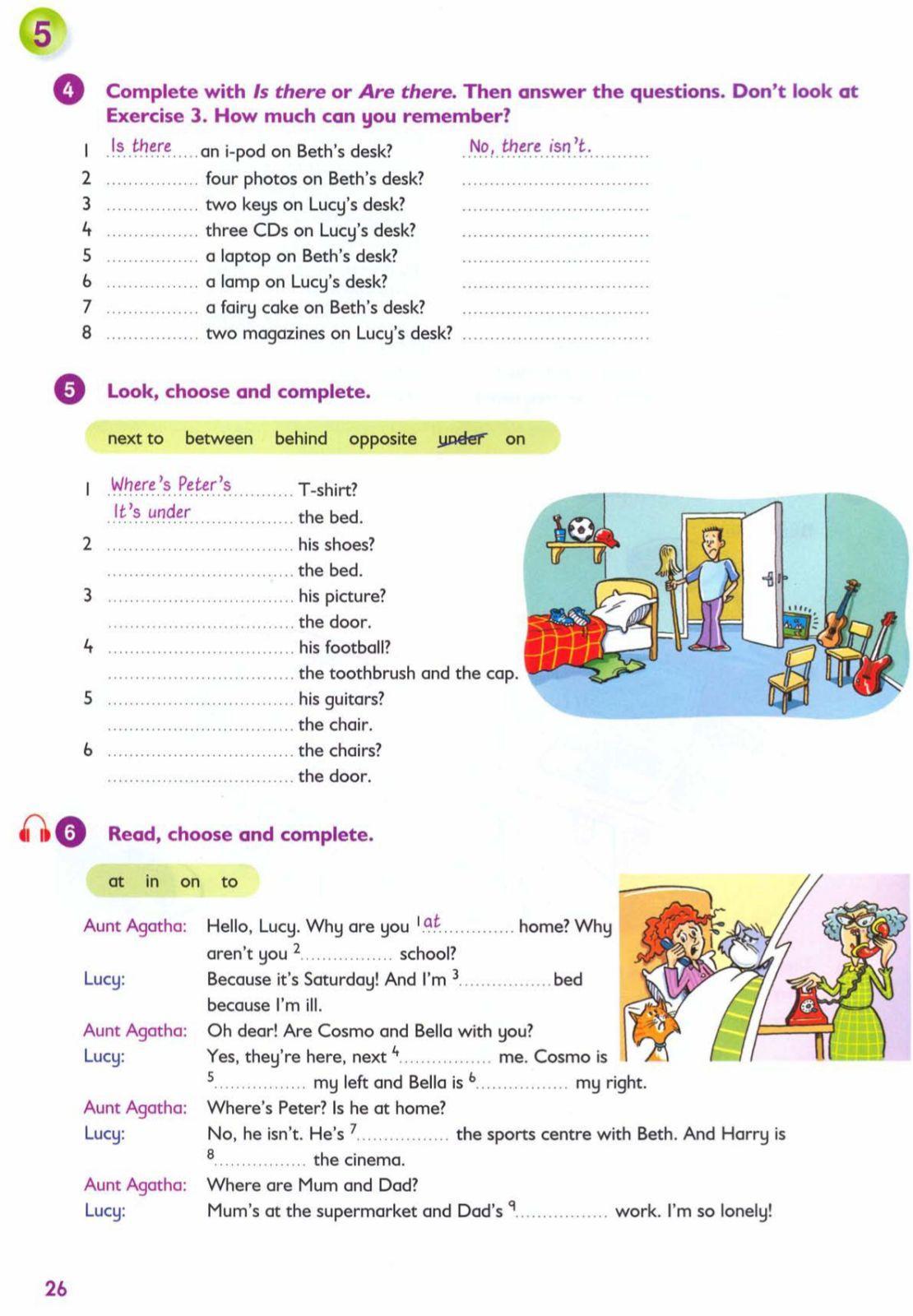 В 4 номере вместо красных линий вставь Yes, there is/Yes, there are или No, there isn't/No, there aren't. Как выбрать, что вставить: смотришь на рисунке в номере 3 (напротив каждого предложения я в скобочках написала на какую из девочек смотреть и что искать), если в вопросе стоит Is, то и в ответе будет Is, если в вопросе аre, то и в ответе are, если на парте есть то, о чем спросили, то Yes, если нет, то No