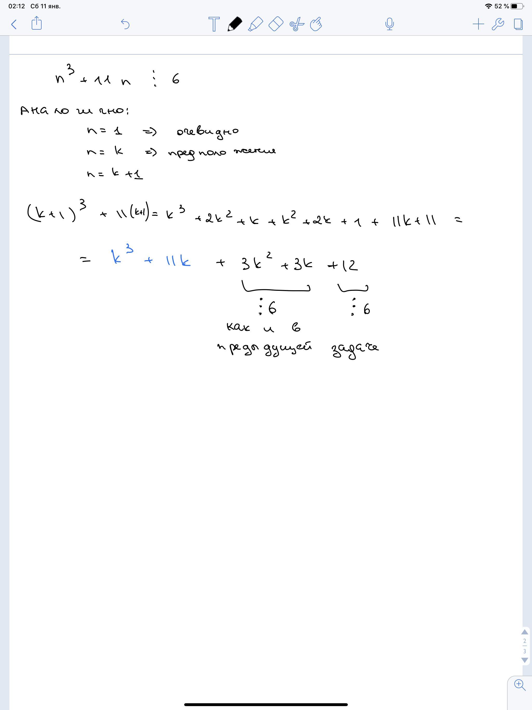 2. n^3+11*n=(n^3-n)+12n. То , что (n^3-n) -n кратно 6 мы уже доказали (по индукци и напрямую). А теперь к выражению прибавили 12n, которые точно кратны 6. так что утверждение доказано.