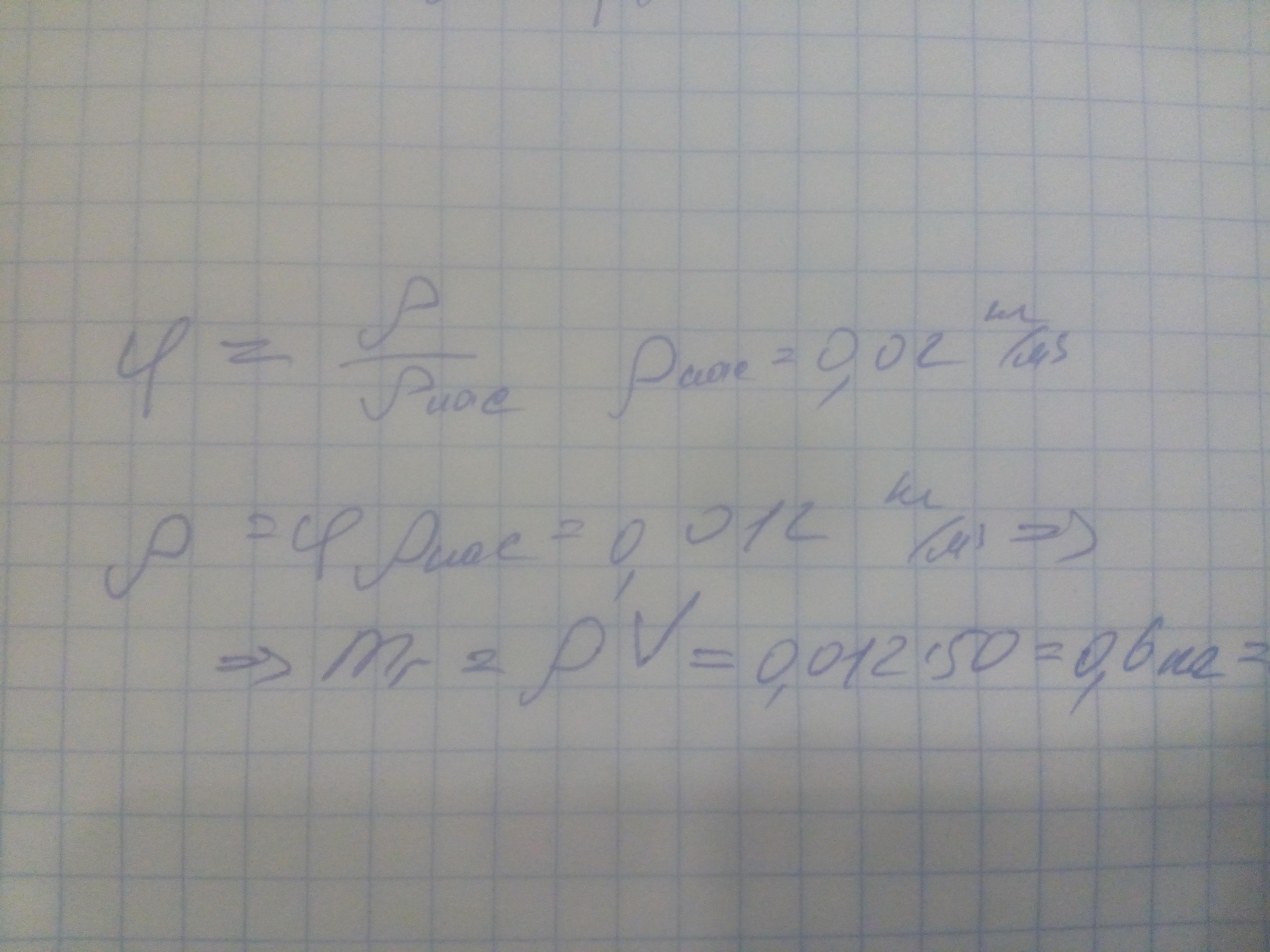 Определите массу (в граммах) водяного пара в воздухе комнаты, если относительная влажность воздуха 60%. Плотность насыщенного пара равна 20 г/м3 , Объем комнаты – 50 м3 .