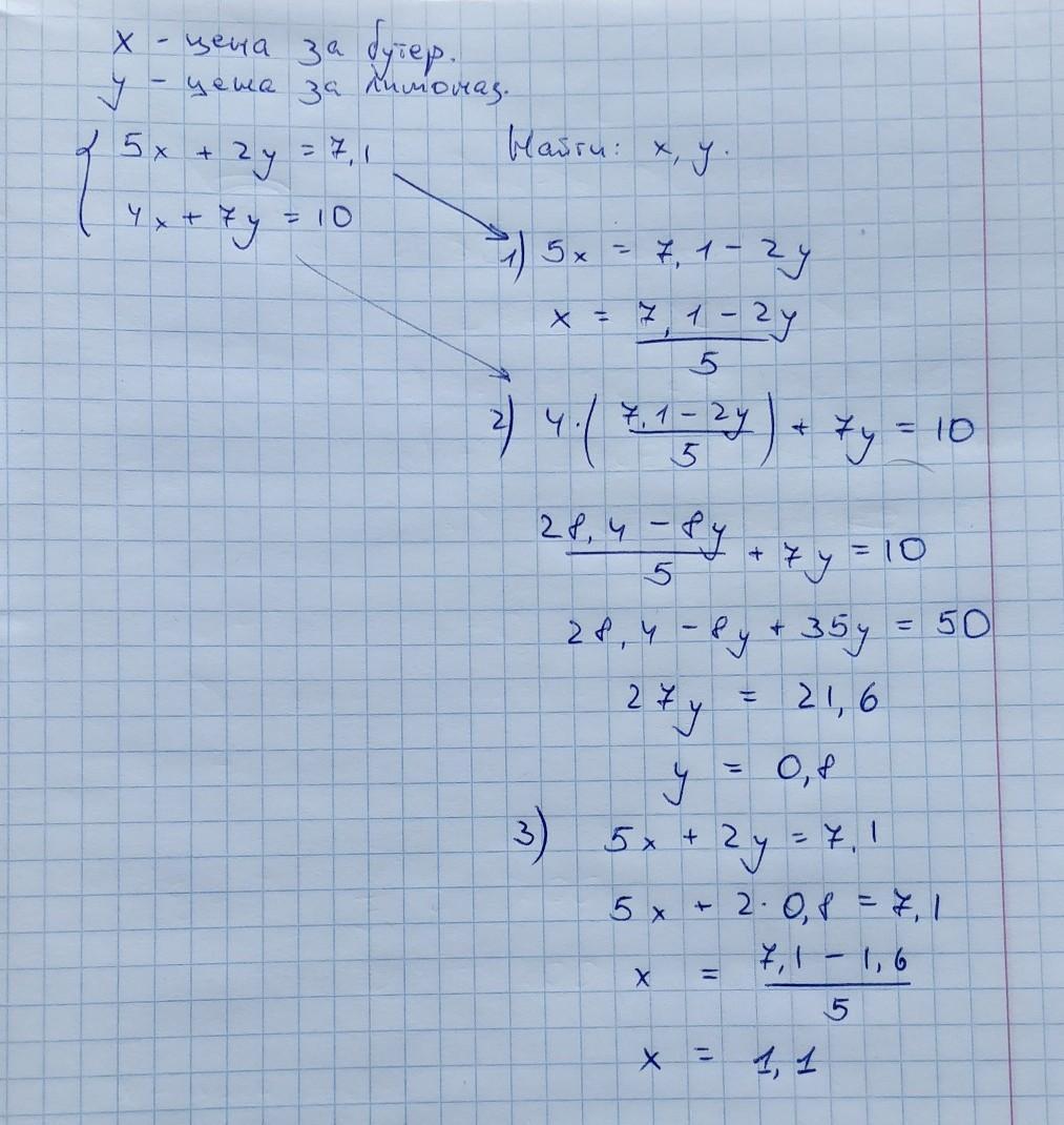 Антон и сергей купили для одноклассников в буфете бутерброд и лимонад. Антон за 5 бутерюродов и 2 бутылки лимонады заплатил 7,1 рублей Сергей за 4 бутербродов и 7 бутылок лимонад заплатил 10 рублей. Сколько стоит 1 бутерброд и 1 лимонад