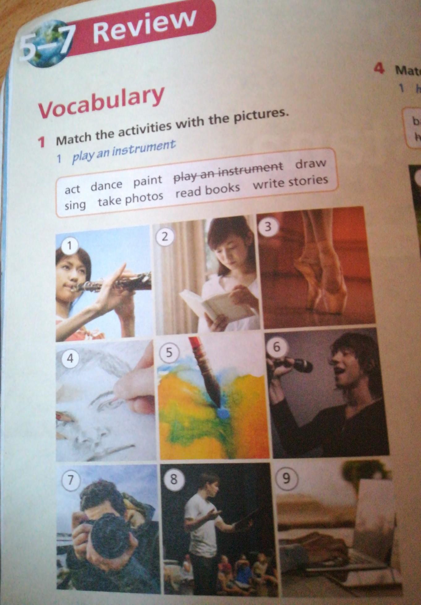 Act - 8, dance-3, draw-4, sing-6, take photo-7, real books-2, Write stories-9, paint-5