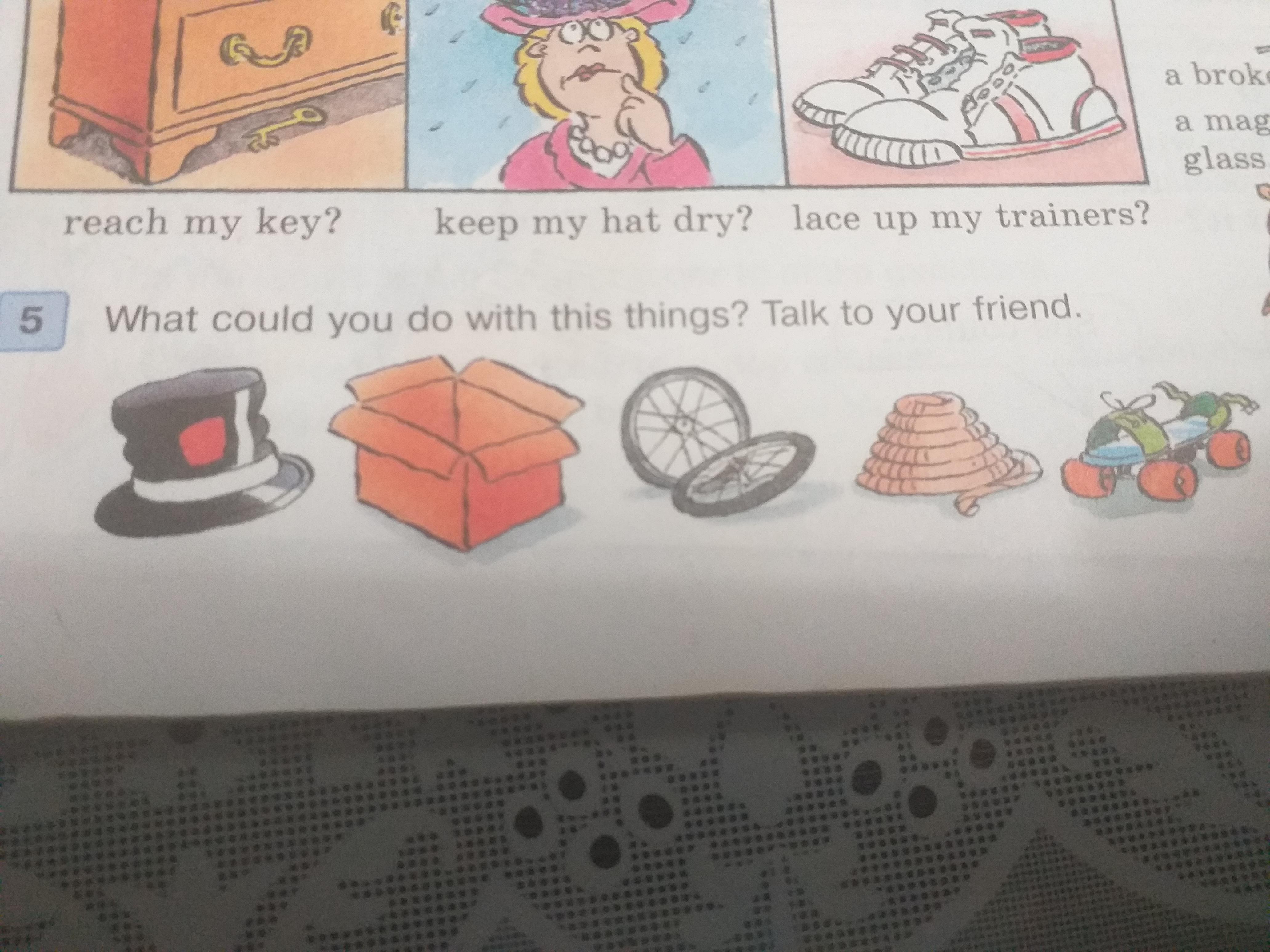 put on a hat, put in a box, fix a wheel,tie with a rope, put on rollers.