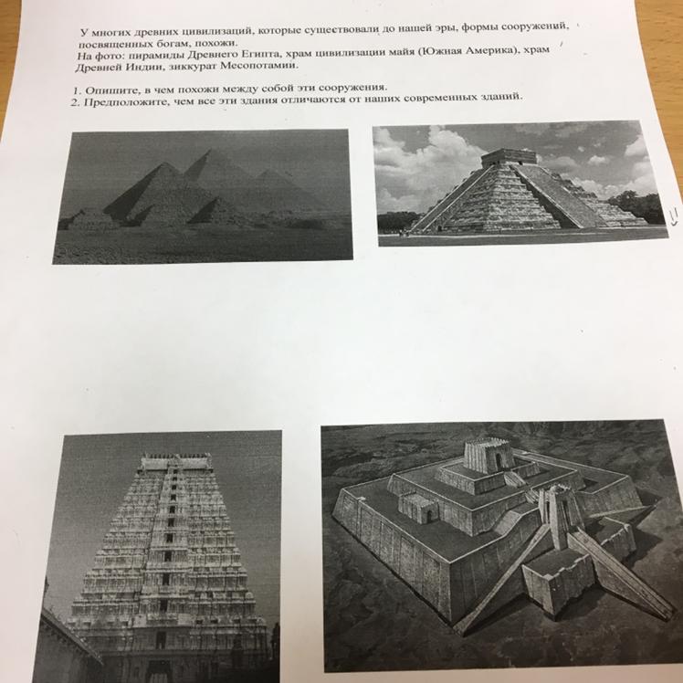 1. Действительно, все четыре пирамидообразных здания имеют определенное сходство, так как построены в конусообразной форме. Историки считают, что пирамиды и в Египте, и в Южной Америке, и в Индии и Месопотамии являются строениями религиозного характера, т.к. в частности в египетских пирамидах были обнаружены усыпальницы фараонов. Конусообразная форма строений, возможно, была выбрана и потому, что для совершения ритуалов нужно было по ступенькам взбираться на самую вершину пирамиды, и постепенное возвышение в итоге над уровнем земли давало дополнительный эффект близости к небу, к богам. Есть также версия, что пирамиды были построены и использовались инопланетянами, которые использовали их для посадки своих кораблей на вершине пирамиды. Эта версия подогревается вопросами о правильности форм камней и их невероятной тяжестью.