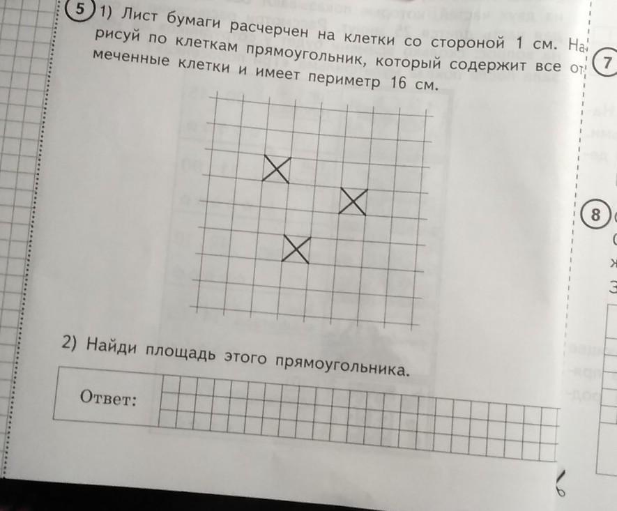 первое лист бумаги расчерчен на клетки со стороной 1 см нарисуй по клеткам прямоугольник который содержит все отмеченные клетки и имеет периметр 16 см найди площадь этого прямоугольника