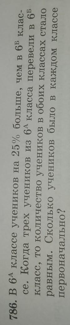 А после того как ученики перевелись получилось 1.25Х - 3 или Х + 3 1.25Х - Х= 3 + 3 0.25Х = 6 Х = 6 : 0.25 Х = 24 1.25Х =1.25 * 24 = 30 учеников было в 6 "А "классе. Ответ : изначально в 6 "А " классе было 30 учеников. А в 6 "Б" классе было 24 ученика