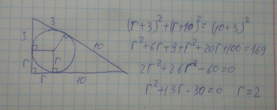 В прямоугольный треугольник вписана окружность, которая поделила гипотенузу точкой касания на отрезки 3 см и 10 см. Найдите радиус этой окружности.
