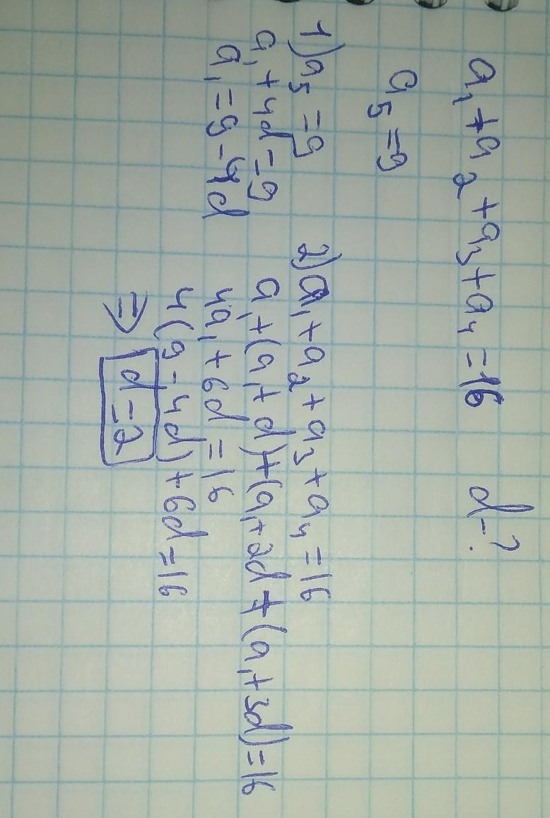Сумма первых четырех членов арифметической прогрессии равна 16, а ее пятый член равен 9. Найдите разность данной прогрессии.