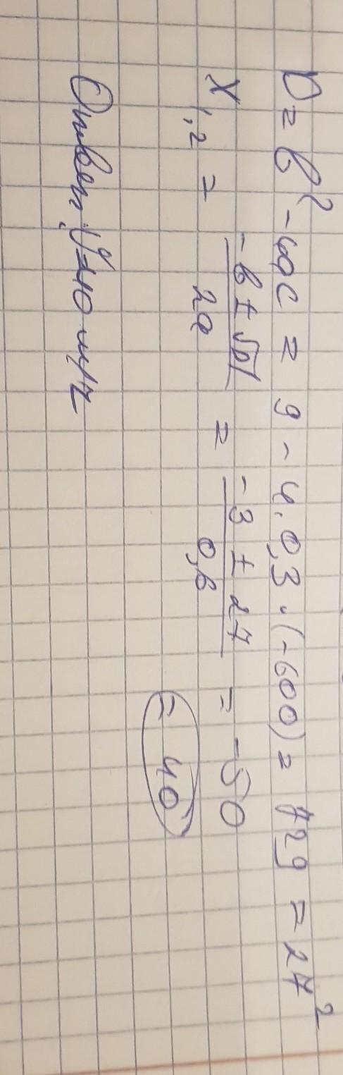 По таблице (которая слева) составляем уравнение, доводим его до квадратного, а далее решаем через Дискриминант, ищем корни. И в ответе мы получаем -50 и 40, соответственно 40км/ч первоначальная скорость поезда. Ответ правильный 100%, т.к. я тоже это решала в школу и в ответах написано 40км/ч
