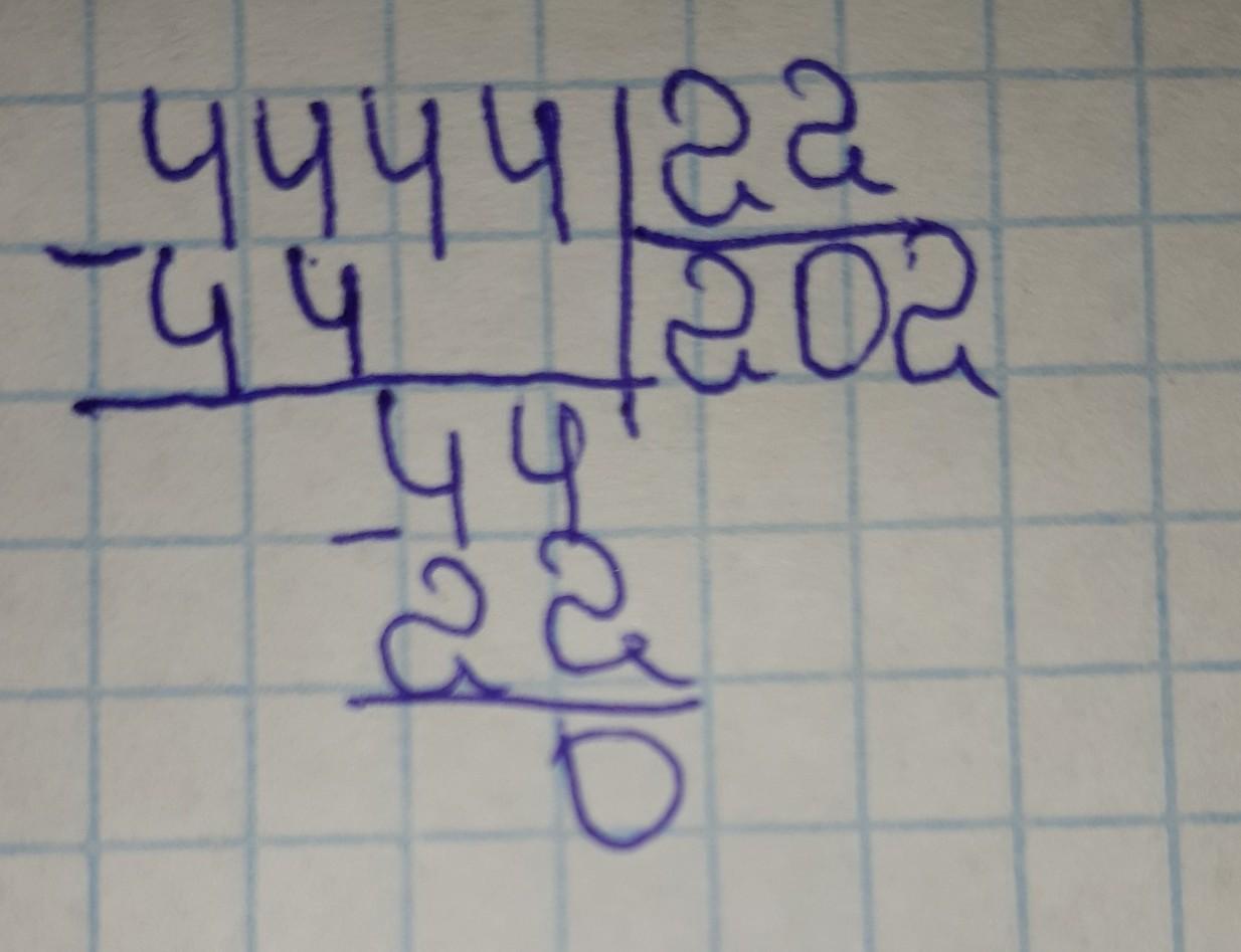 Спускается в низ число 4 оно не делится на 22, поэтому второе число =0