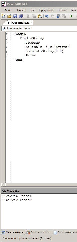 Можно записать и одной строкой решение, но будет длинно: ReadlnString.ToWords.Select(w -> w.Inverse).JoinIntoString(' ').Print