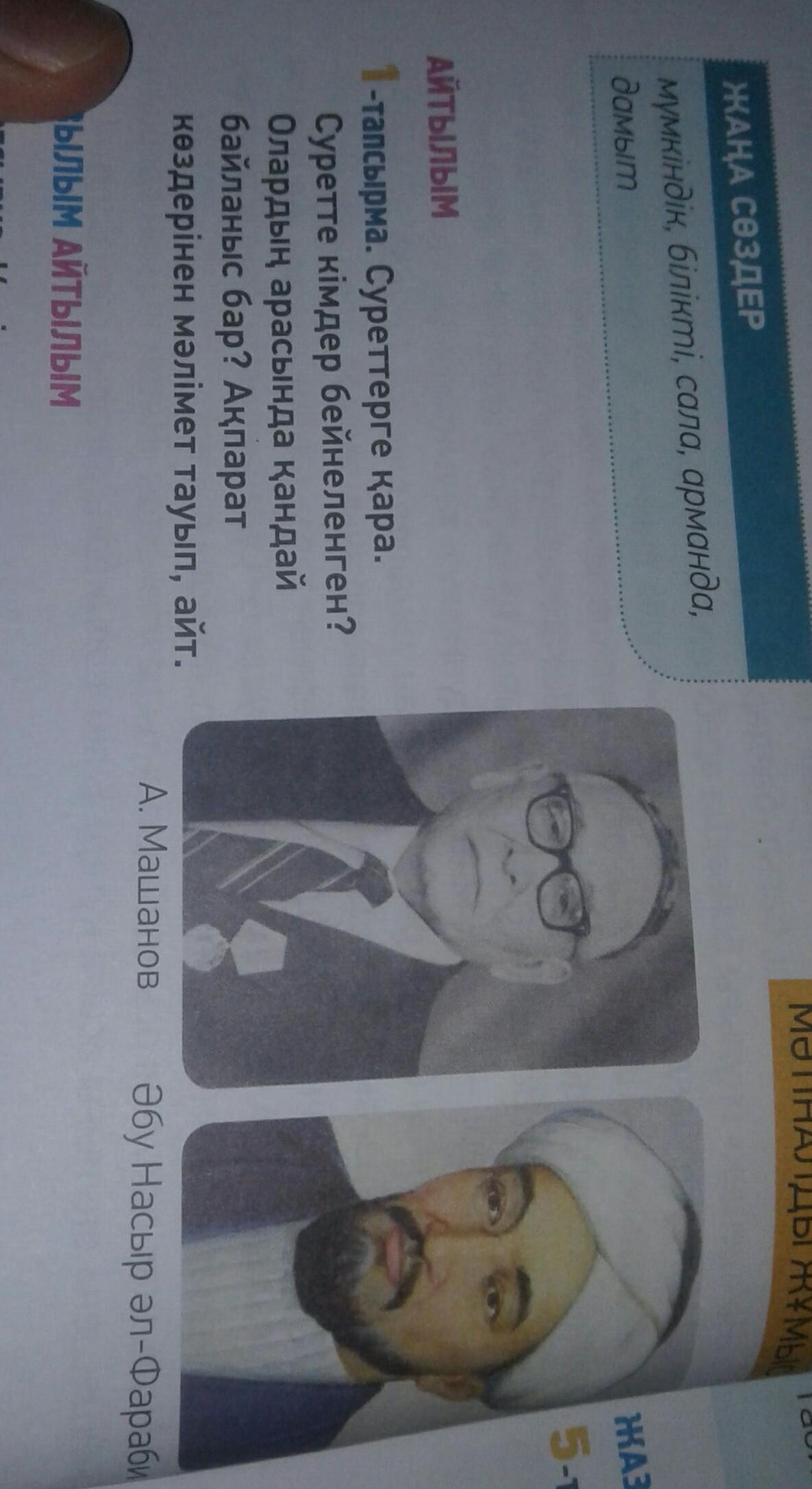 Суретте Акжан Машанов(Аль-Машани) мен Әбу Насыр әл-Фараби суреттелген. Әбу Насыр әлемге әйгілі ойшыл, философ, социолог, математик, физик, астроном, ботаник, лингвист, логика, музыка зерттеушісі. Ал А. Машанов қазақтың әйгілі ғалымы педагог, жазушы. Екеуі де қазақтың ғылымын дамытты, Олар нағыз энциклопедиялық білімге, бай ғылыми білімге ие, жаңа нәрселерді игеріп қана қоймай,ғылыми және педагогикалық қызметінде сәтті қолдана білді.