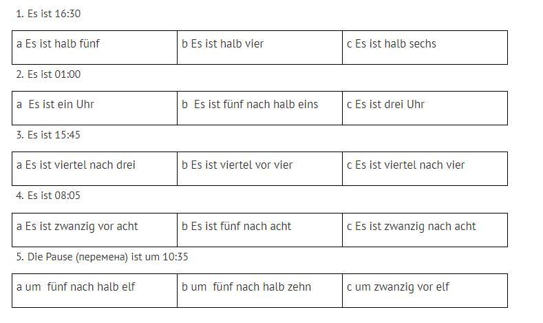 Например: Es ist 10:30 – a Es ist halb elf b Es ist halb zwölf c es ist halb zwei
