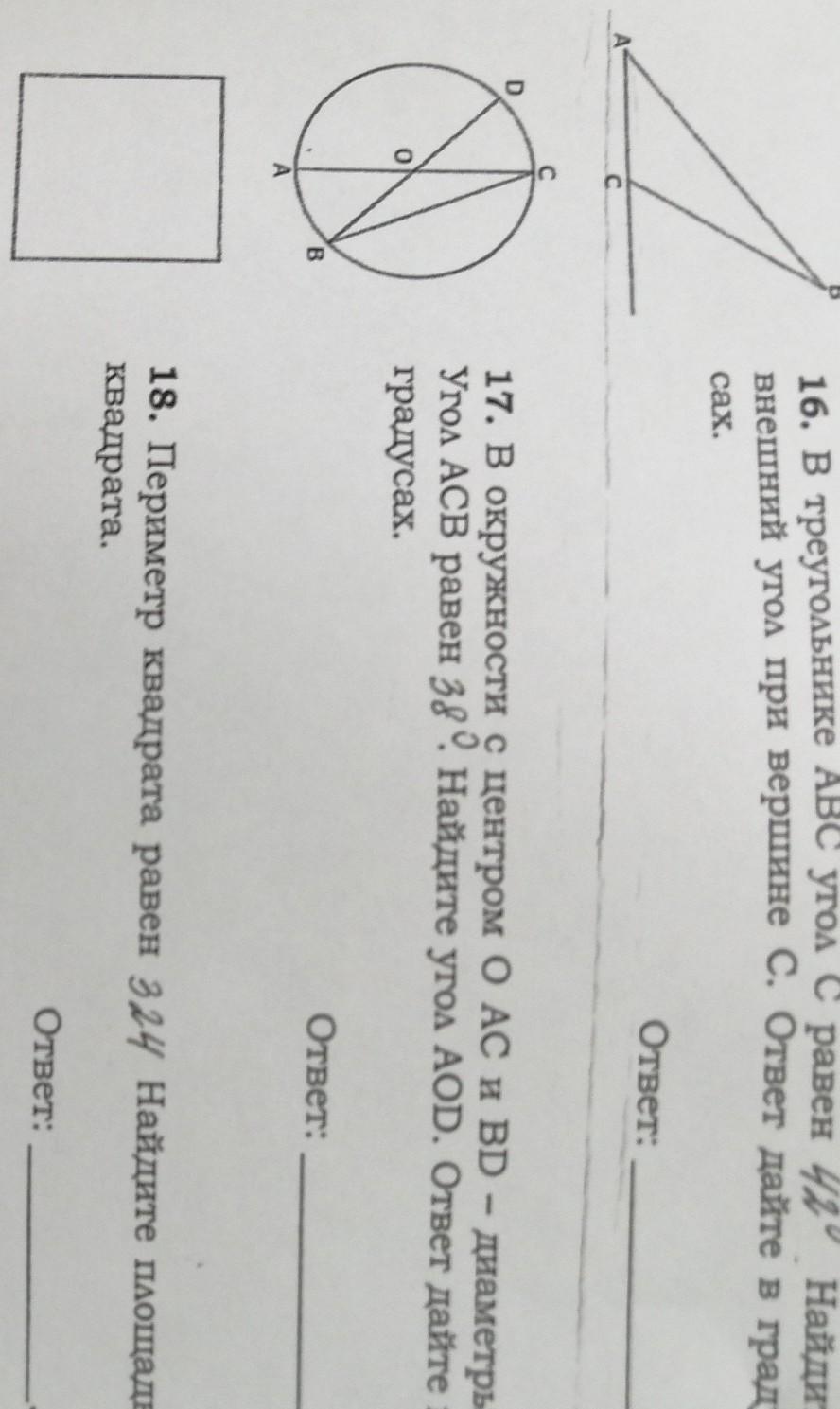 Пошаговое объяснение:задание17 acb =38, дуга=38*2=76, дуга db =180, угол aod =180-76= 104