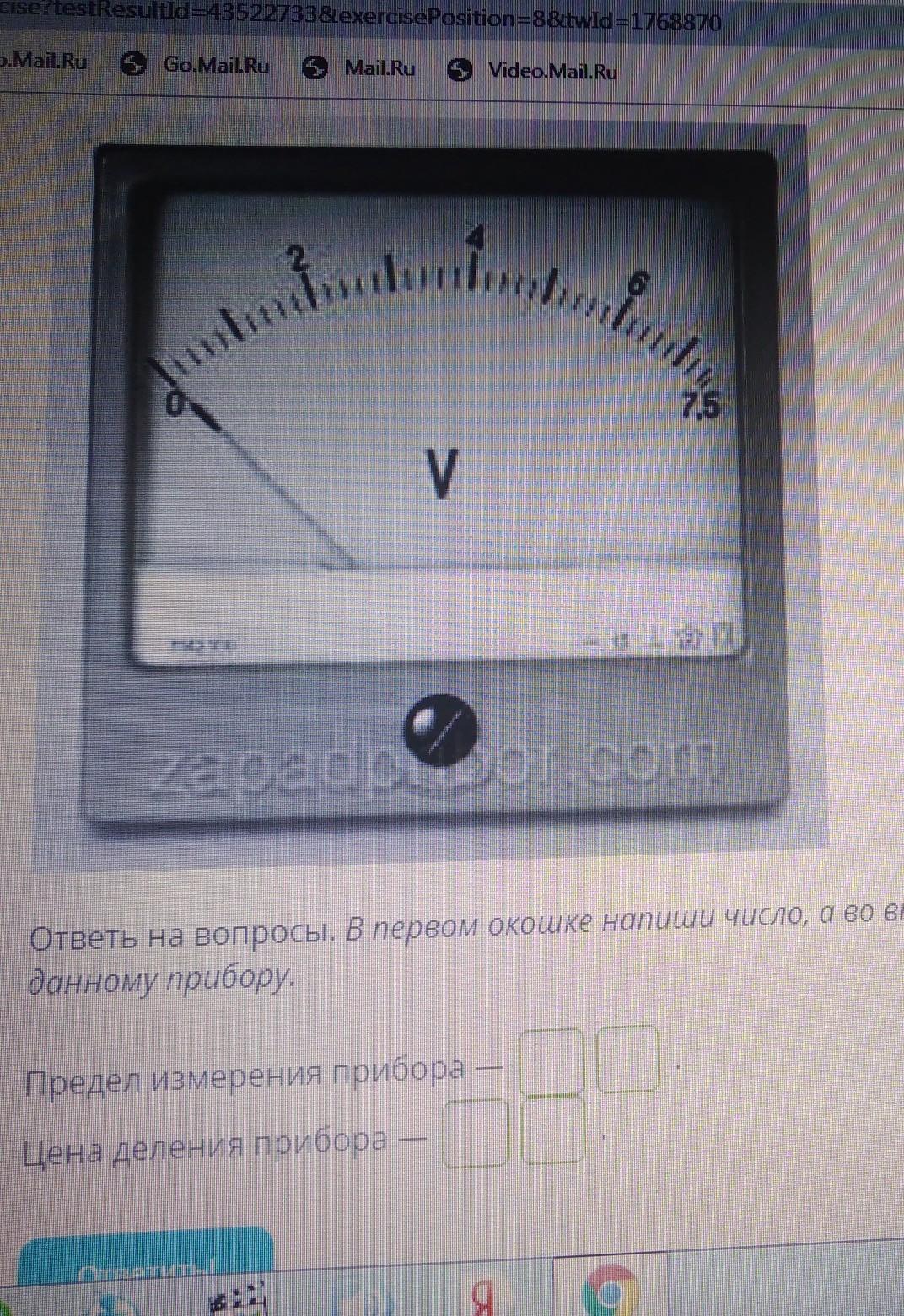 Ответь на вопросы. В первом окошке напиши число, а во втором - единицу измерения, соответствующую данному прибору.
