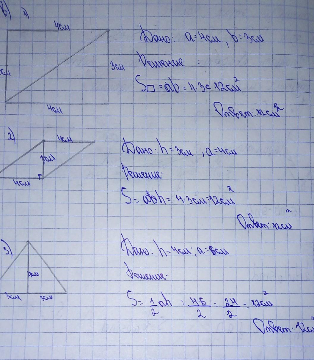 Вырежьте из бумаги два равных прямоугольных треугольника с катетами 3 см и 4 см.Составьте из них: 1)прямоугольник 2)параллелограмм 3)равнобедренный треугольник. Чему равны площади этих фигур?