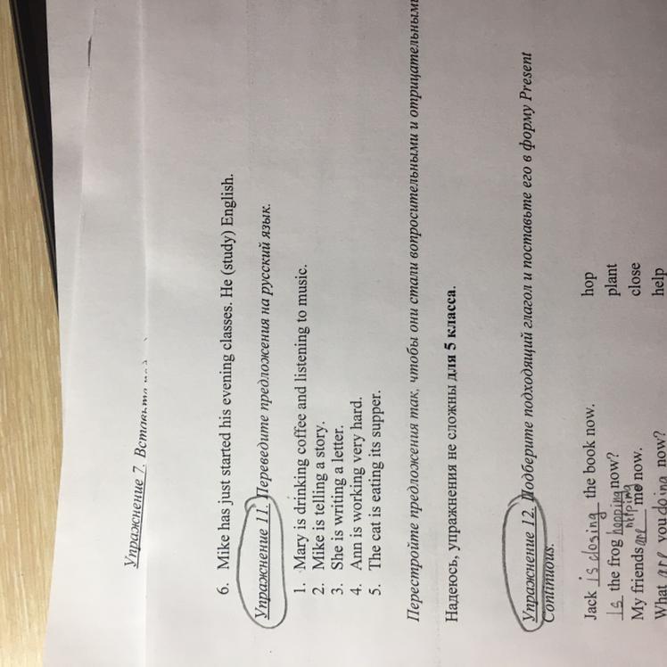 1. Мэри пьет кофе и слушает музыку. 2. Майк рассказывает историю. 3. Она пишет письмо. 4. Энн работает очень усердно. 5. Кошка ест ужин.
