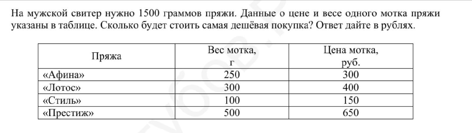 На мужской свитер нужно 1500 граммов пряжи.Данные о цене и весе одного мотка пряжи указаны в таблице.Сколько будет стоить самая дешёвая покупка ?Ответ дайте в рублях(пж очень срочно надо!!!)