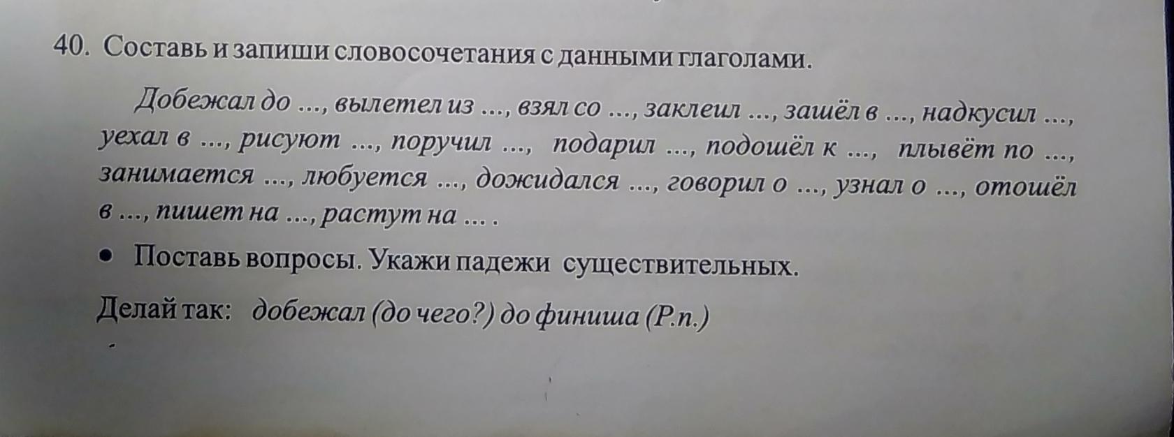 Добежал до станций,вылетел из окна ,взял со стола,заклеила,зашёл в дом,надкусила,уехал в город, рисуют пейзаж поручил донести,подарил машину, подошёл к кошке,плывёт по озеру, занимается борьбой,любуется цветком,дожидался друга, говорил о транспорте,узнал о уроках,отошёл в кофе,пишет на листочке,растут на подоконнике