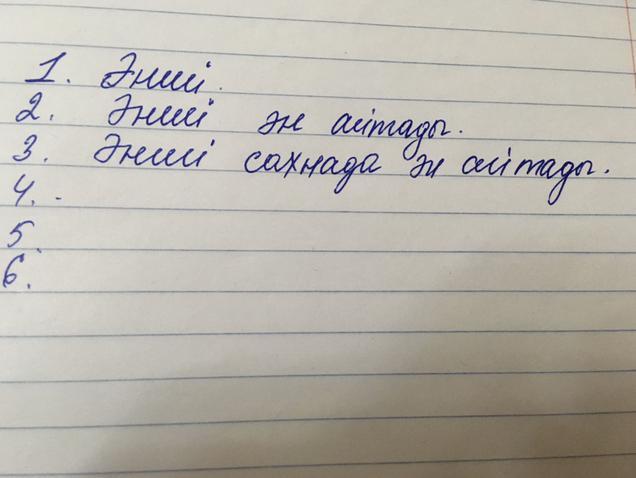 Здравствуйте помогите пожалуйста правильно написать по казахскому языку шесть (6) предложений по примеру с перевод на русский ( на примере показано только три предложения) просьба не знающих просьба не отвечать