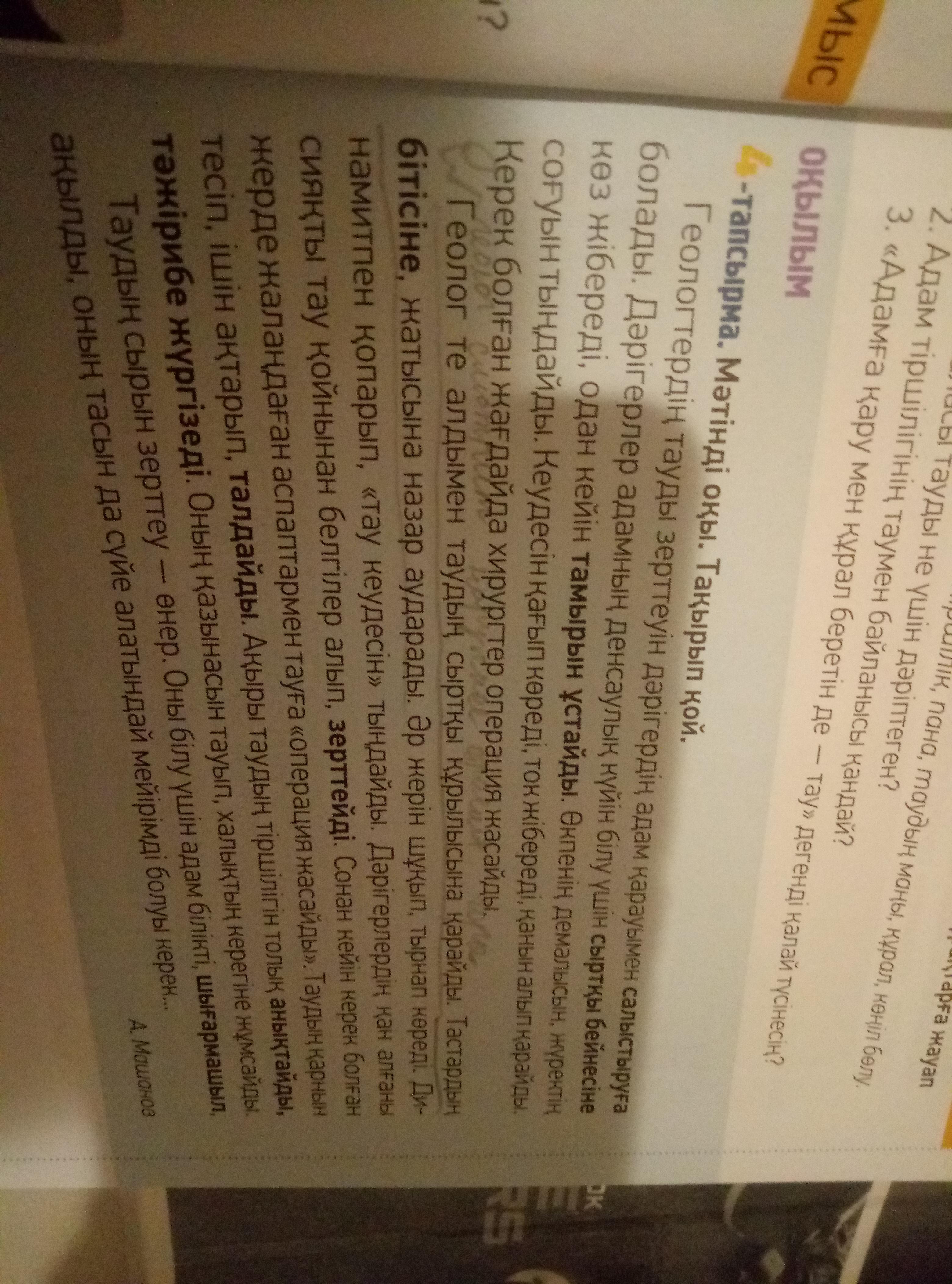 Геолог также смотрит сначала на внешнее строение горы.Обращает внимание на конец камня,залегание.Каждый видит свою землю, и ногтями.Подрывает динамит и слушает горную грудь.Так же, как и взятие крови врачами, получают симптомы и исследуют горные пласты.После этого в нужном месте обнаженные инструменты делают операцию на гору.Сквозь горы в честь праздника курбан-байрам,внутри навалом,анализирует.В конце концов, в полной мере определяет жизнедеятельность гор, ведет дисциплину.Его сокровище найдет и тратит на нужды народа