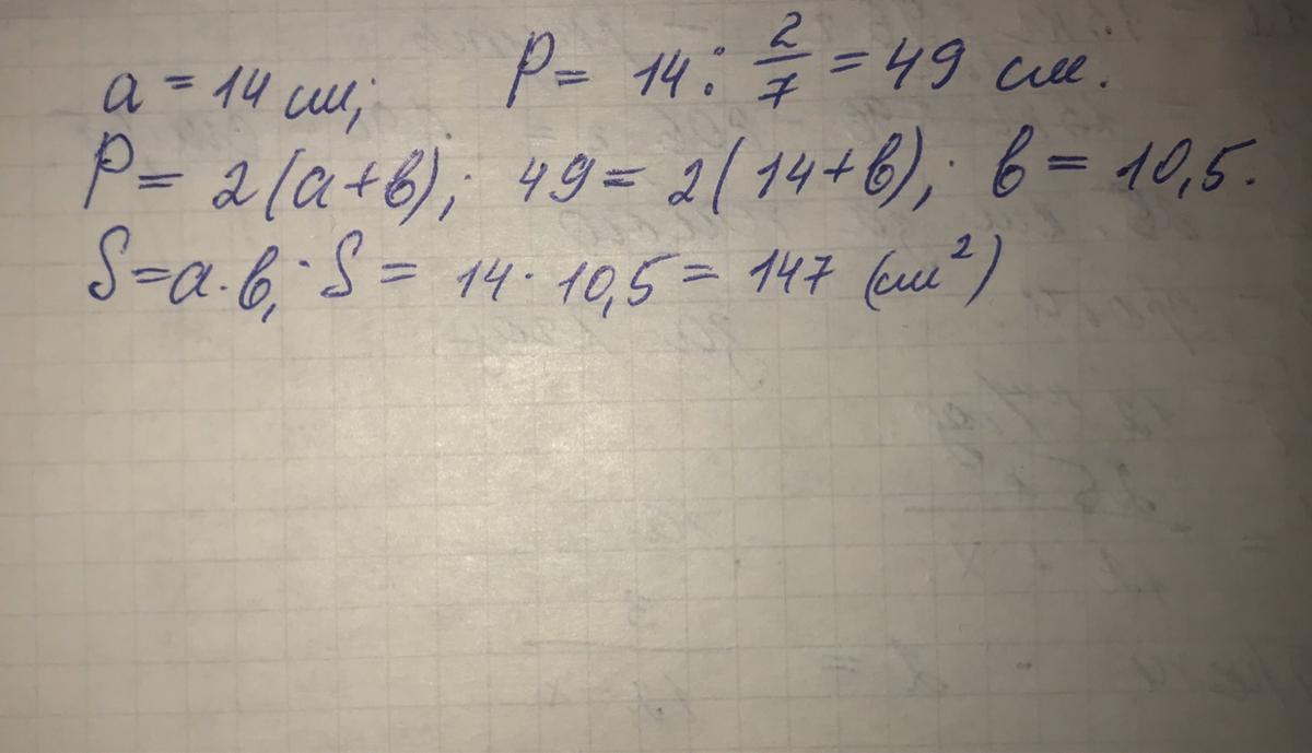 Сторона прямоугольника 14 см,что составляет 2/7 его периметра.Чему равна площадь прямоугольника?