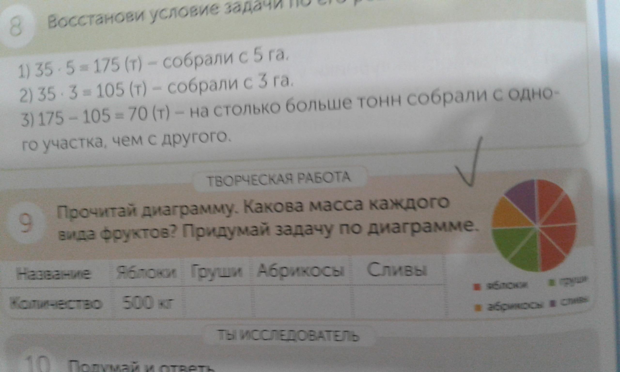 так как яблоки 4 части 500 кг, значит 500:4= 125кг, 125*2(части)=250 кг груши;125*1=125 сливы и абрикосы кг
