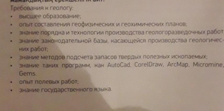 JII YERSNIIII-нің МУМОУНДИКАЛЫҚ Геологқа қойылатын талаптар: жоғары білім, геофизикалық және геохимиялық жоспарларды құрастыру тәжірибесі, геологиялық барлау жұмыстарын жүргізудің тәртібі мен технологиясын білу, геологиялық жұмыстарды өндіруге қатысты заңнамалық базаны білу; Қатты минералды қорларды есептеу әдістерін түсіну: AutoCad сияқты бағдарламаларды білу. CorelDraw, ArcMap, Micromine. Дала тәжірибесі, мемлекеттік тілді білу.